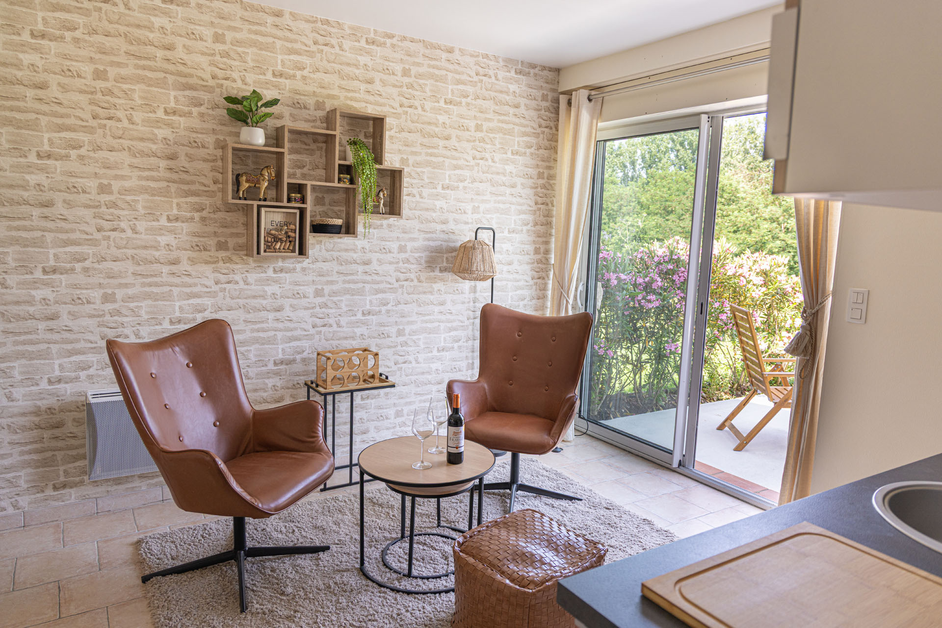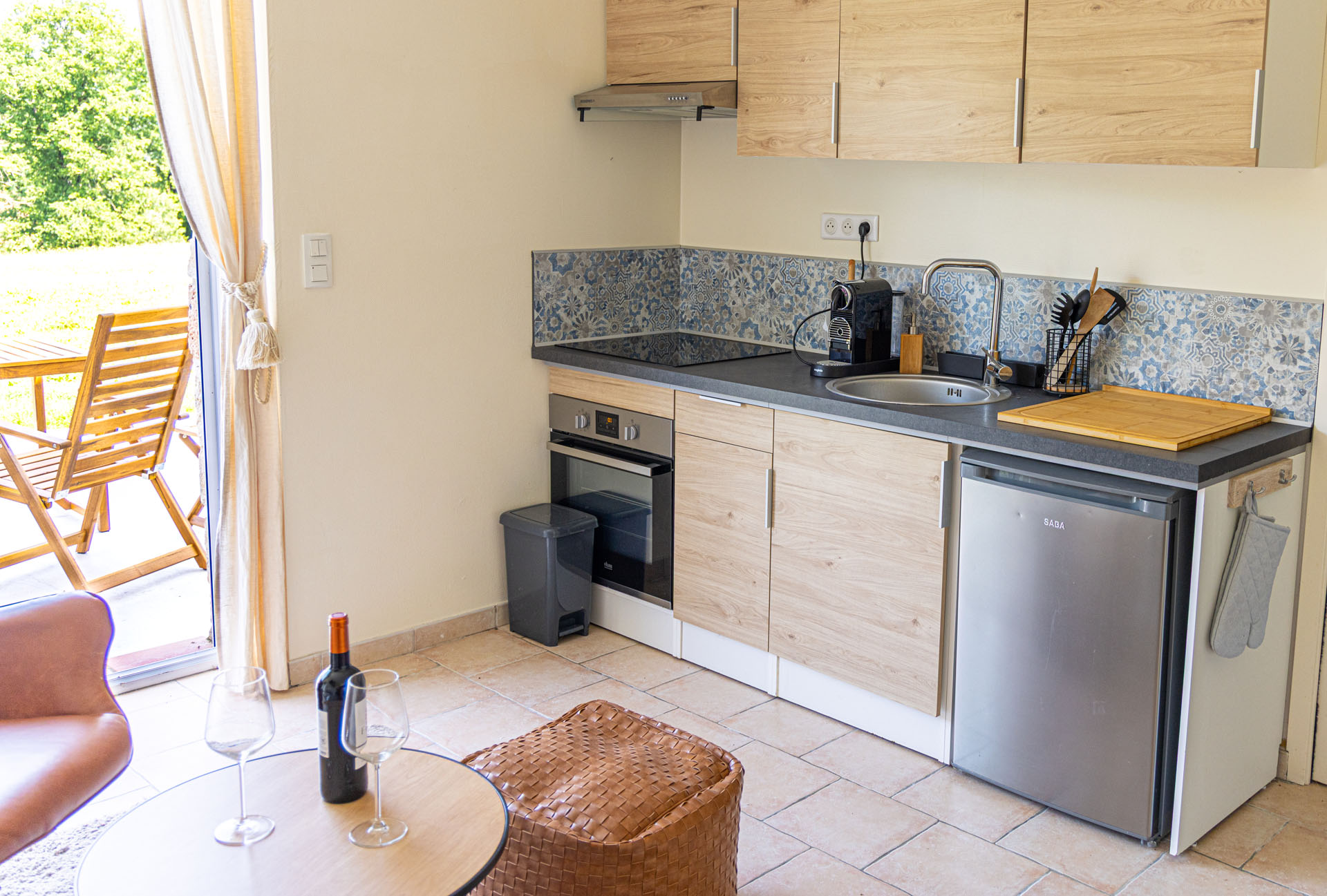 Ce gîte intimiste comprend une chambre avec lit king size et literie premium, une salle de bain moderne avec douche à l’italienne, un salon cosy avec coin repas et une cuisine entièrement équipée avec machine Nespresso, WiFi haut débit et tout l’électroménager nécessaire pour un séjour confortable.
